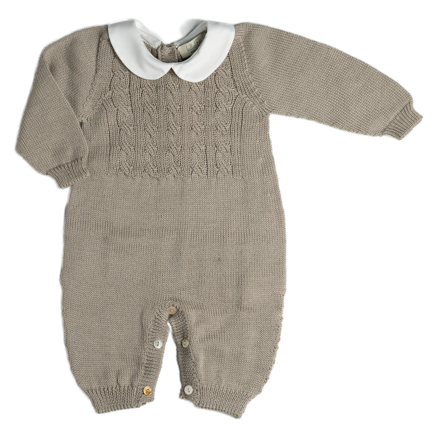 Tutina in lana merinos 100% extra fine che offre comfort e calore al tuo bambino, elegante pratico e sicura con bottoni in vera madre perla, si apre sul retro e sul cavallo per una maggiore semplicità nel vestire il neonato.