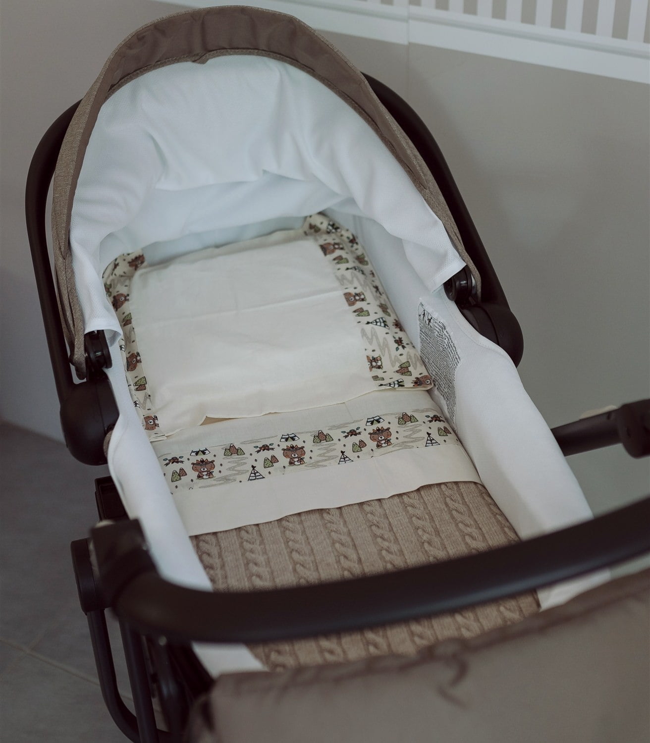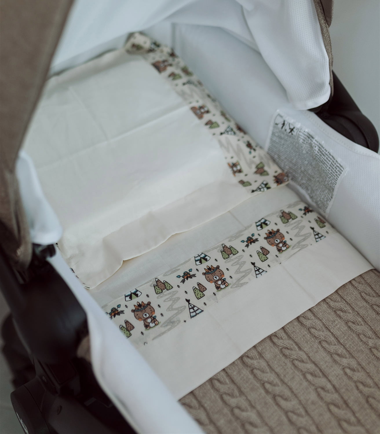 Lenzuola carrozzina realizzate in puro cotone, set completo di lenzuolo e federa abbinate più lenzuolo con angoli dal design raffinato con stampe eleganti e coordinati ai set nascita.